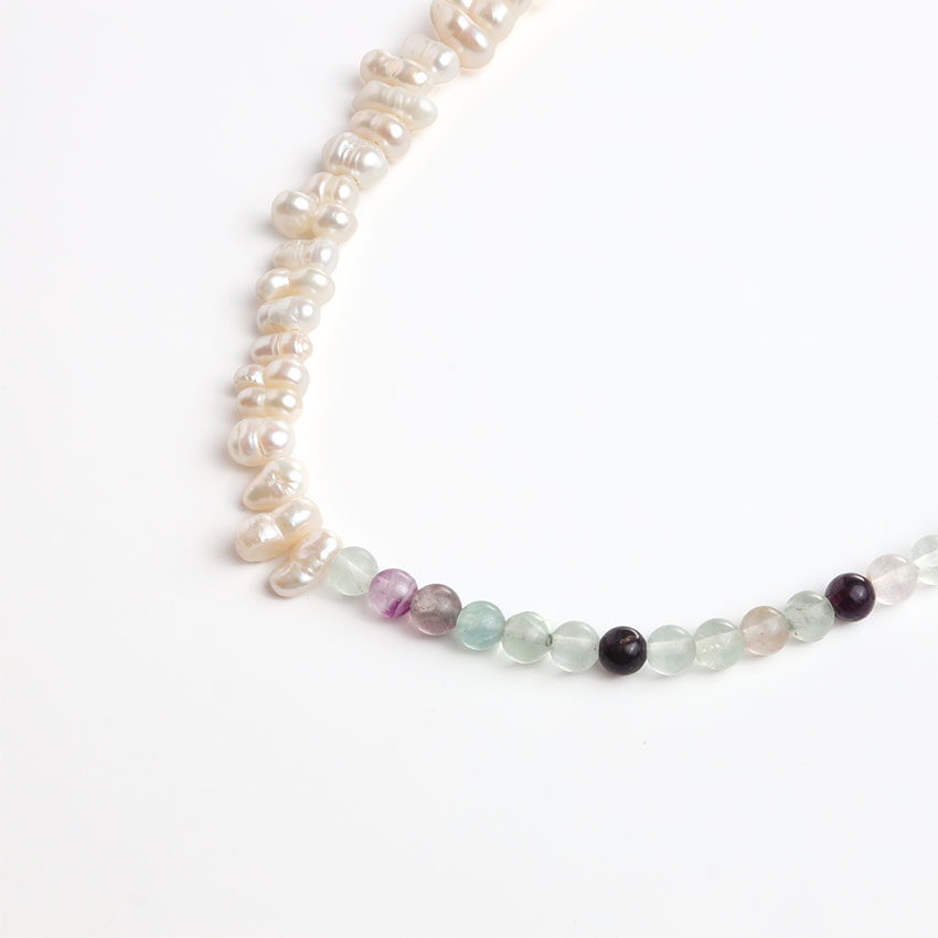 A necklace created for the curious and radiant woman who embraces change and duality with ease. Fluorite, the stone of clarity and focus, calms a restless mind, enhances intuition, and brings order to scattered thoughts, while freshwater pearls — timeless symbols of wisdom and grace — soften this energy with serenity and elegance.