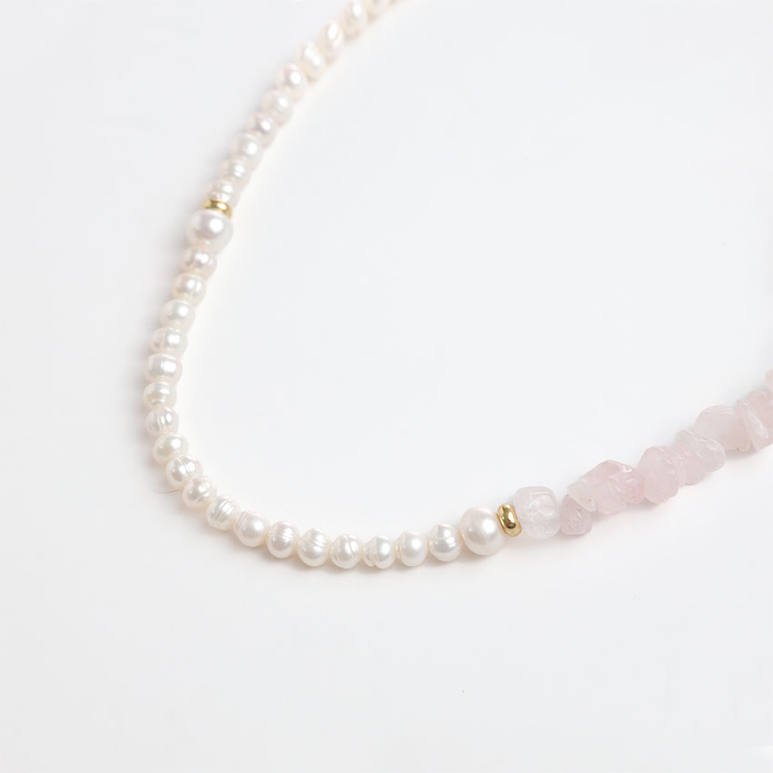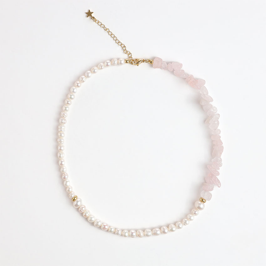 Handmade with cultured pearls and chips rose quartz gemstones, this necklace measures 38 cm and is finished with an 18k gold-plated clasp. Every detail is chosen with intention – jewellery that carries meaning, not just beauty.