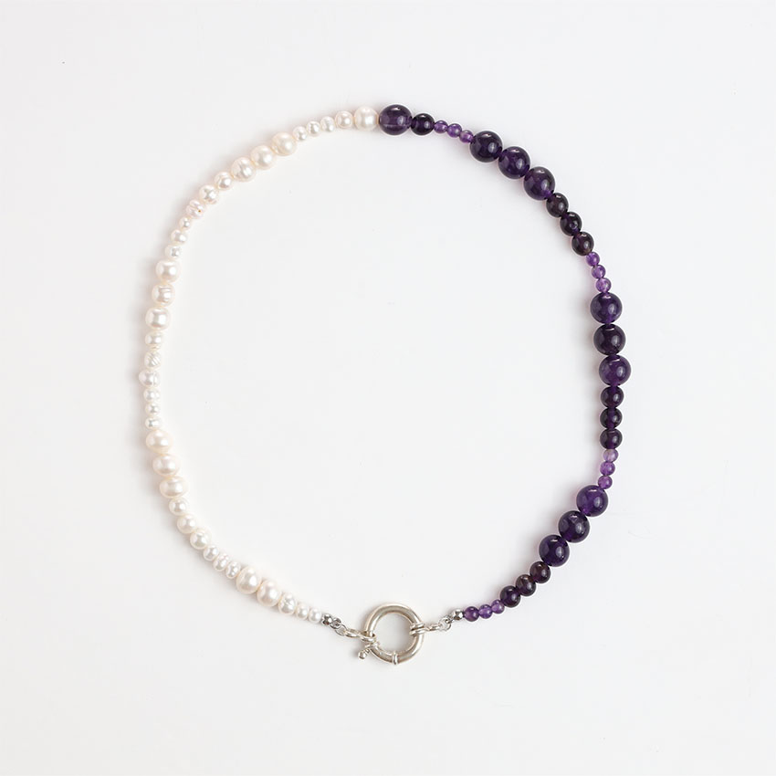 Handmade with cultured pearls and purple amethyst gemstones, this necklace measures 38 cm and is finished with a silver round toggle. Every detail is chosen with intention – jewellery that carries meaning, not just beauty.