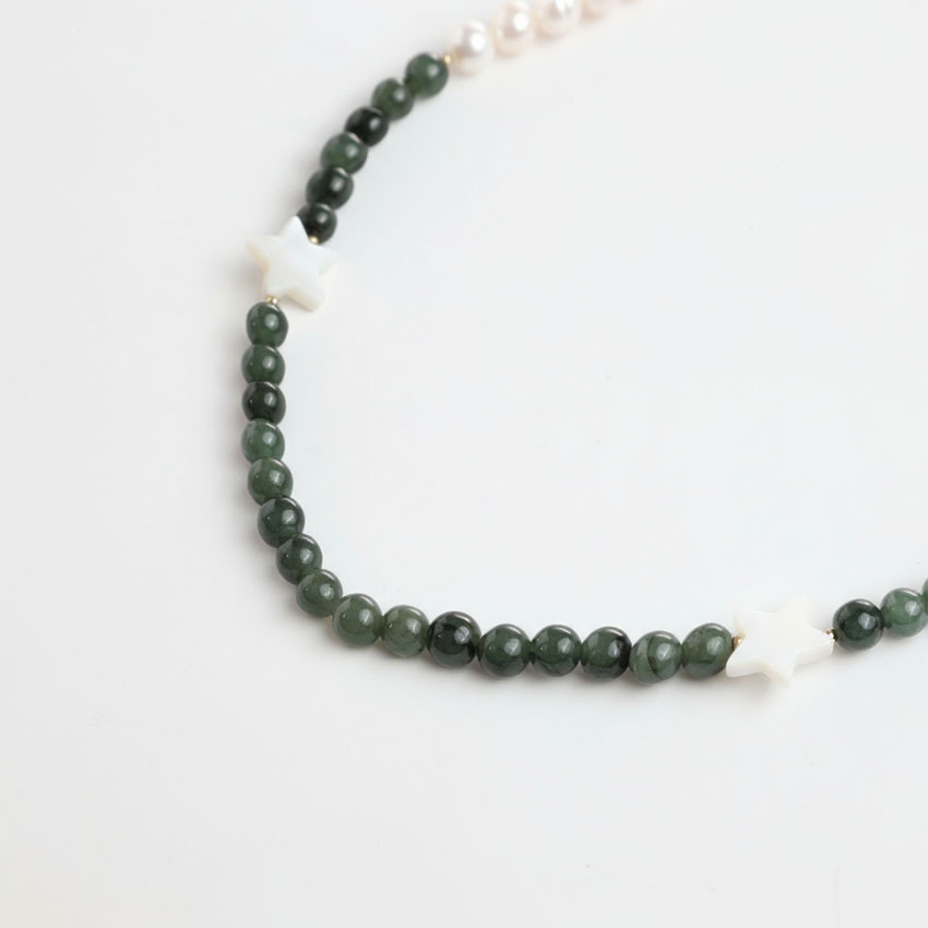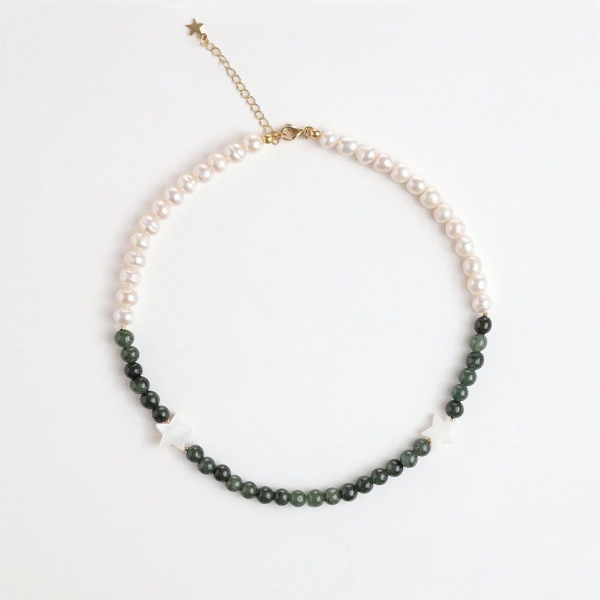 Handmade with cultured pearls and burma jade gemstones, this necklace measures 38 cm with a 5 cm extender and is finished with a 18k gold-plated clasp. Every detail is chosen with intention – jewellery that carries meaning, not just beauty.